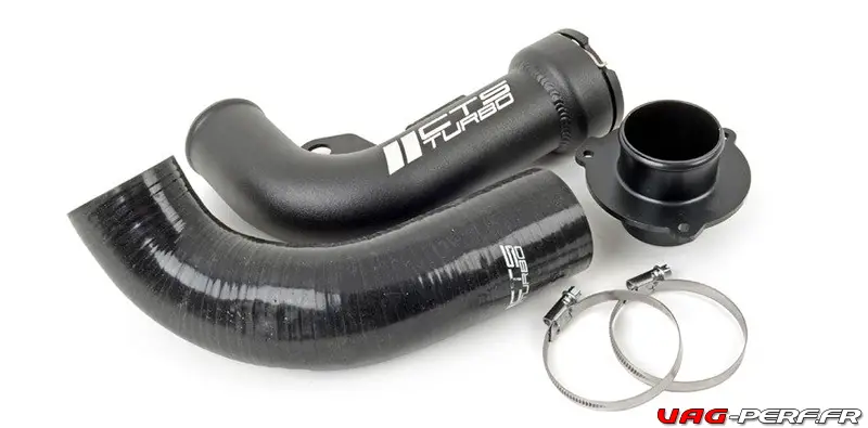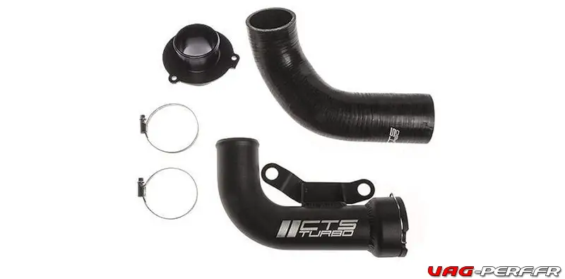Le but de l’installation de l’Outlet CTS Turbo, est d’avoir un débit d’air bien plus important et moins restreint. La pièce d’origine sur le moteur EA113 est très restrictive (pour des questions de bruit) mais elle bride considérablement le moteur. Le Kit contient une durite en aluminium, un Turbo Mufler delete ainsi que tout le nécessaire pour l’installation.