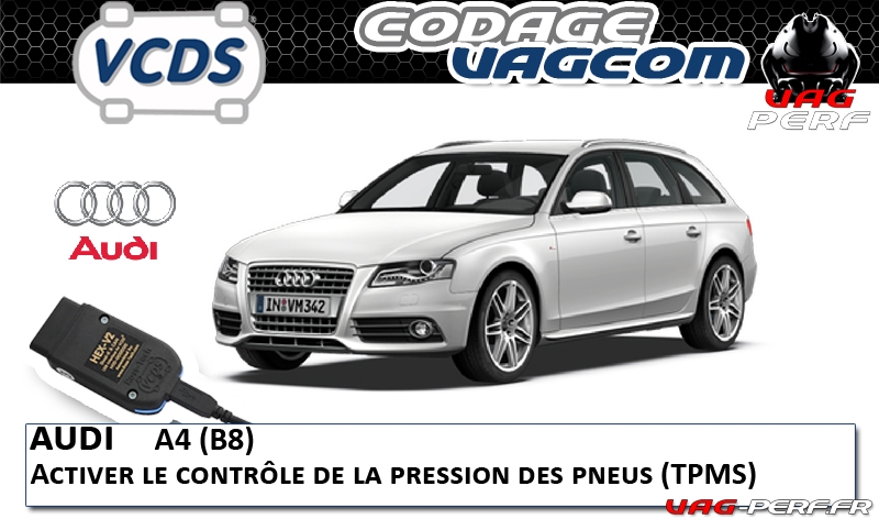 Ce codage VAGCOM permet d’activer la surveillance de la pression des pneus sur Audi A4 (B8) avec affichage dans le MMI et dans le combiné d’instruments. La fonction utilisée ici correspond au TPMS indirect (via l’ABS), qui détecte une variation de pression par analyse des vitesses de rotation des roues.