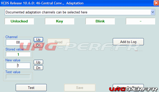 Chemin dans le logiciel VCDS : [46 – Module Confort] -> [Adaptation – 10] -> Canal 08