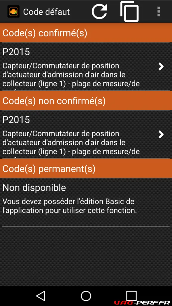 On voit ici le code défaut : P2015 et on relèvera aussi la dénomination « Intake Manifold flap position sensor (bank 1) ». Cela nous permet de comprendre que nous avons un soucis sur le collecteur d’admission, au niveau de la sonde de position des volets.